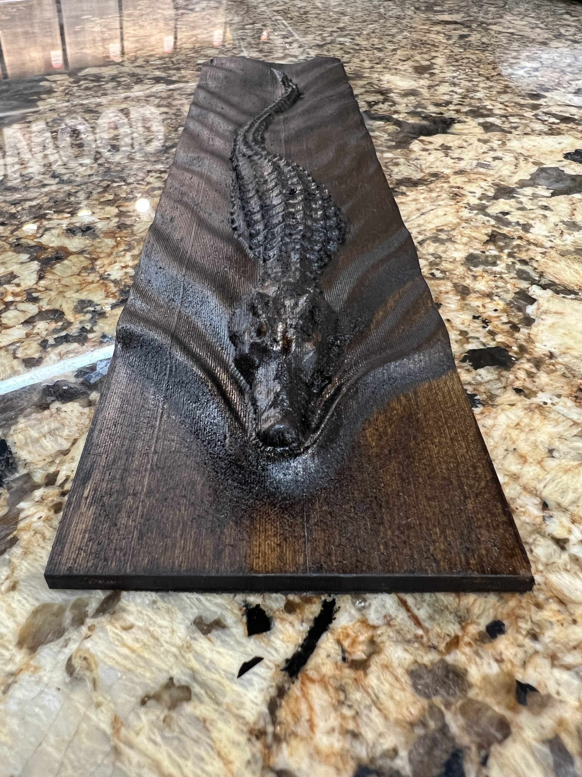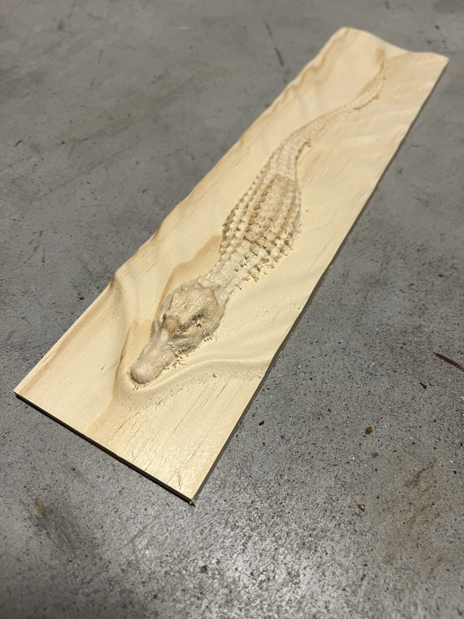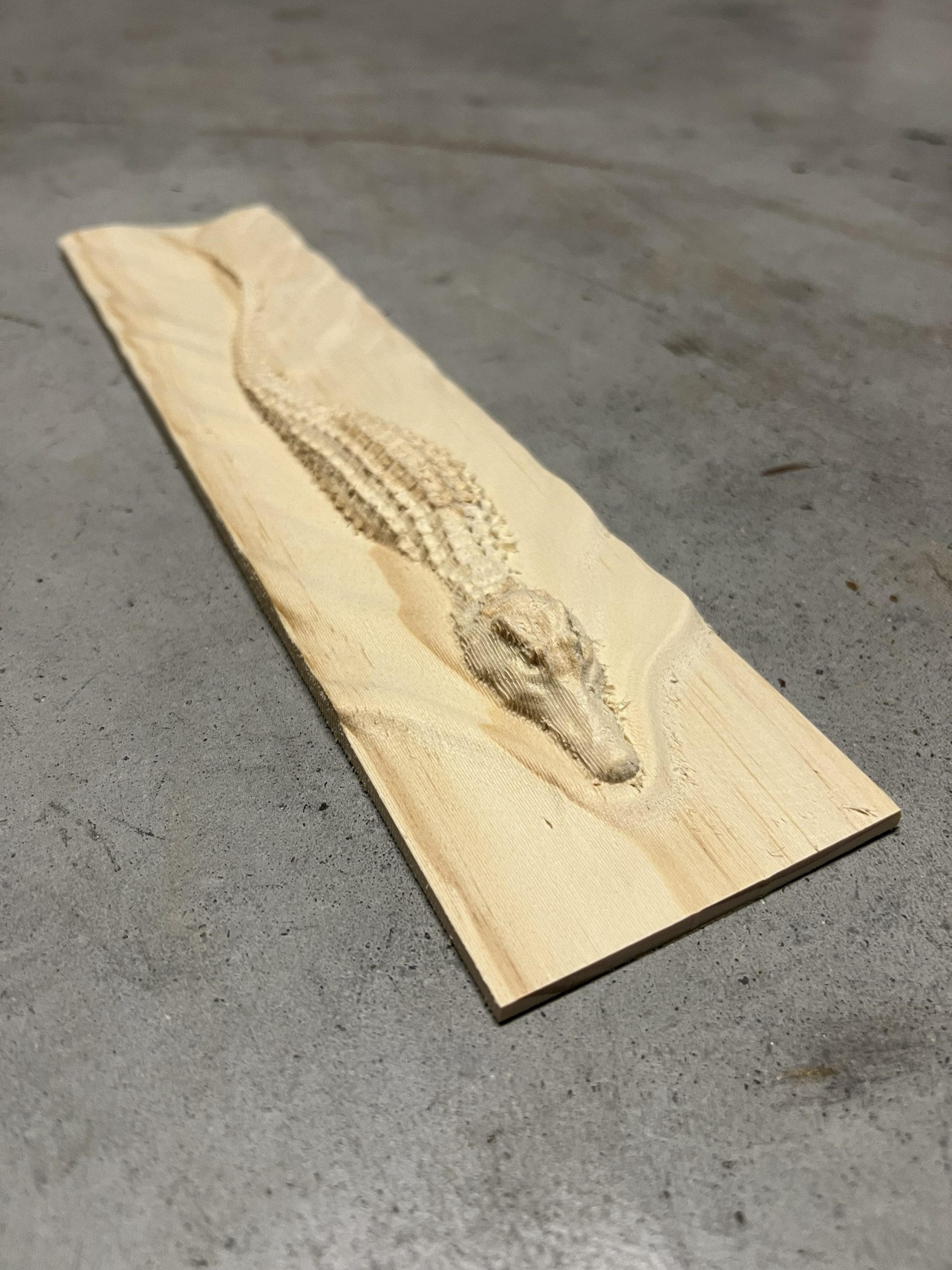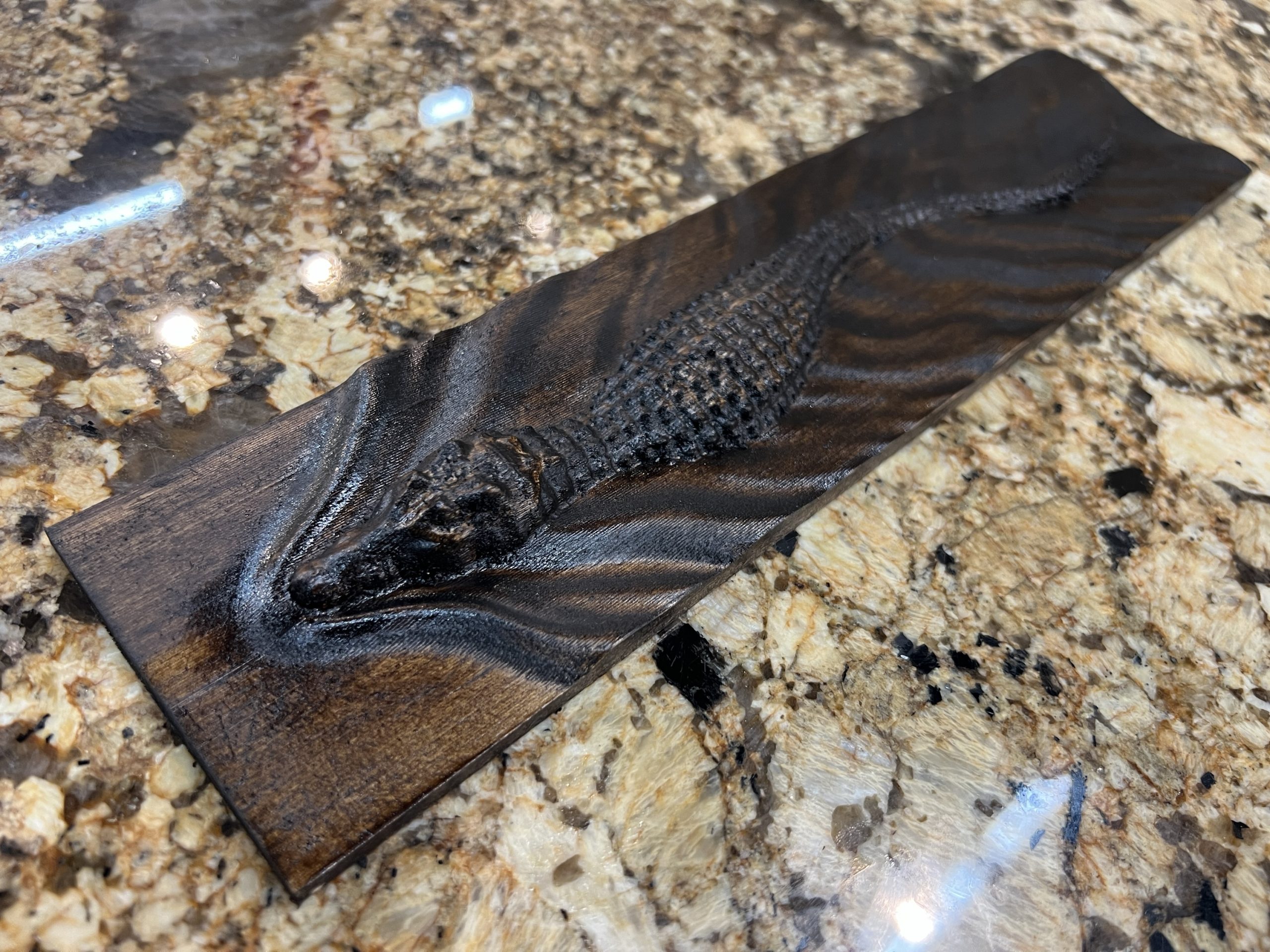 This one-of-a-kind CNC-carved wooden artwork features a stunningly detailed alligator design that showcases the beauty of precision craftsmanship. Measuring 3” x 7”, this intricate piece is perfect for adding a touch of rustic elegance and unique artistry to any space.